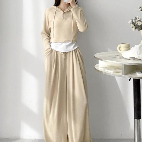 [옷자락] 여자 레이어드 버튼 크롭 후드티 핀턱 와이드팬트 세트