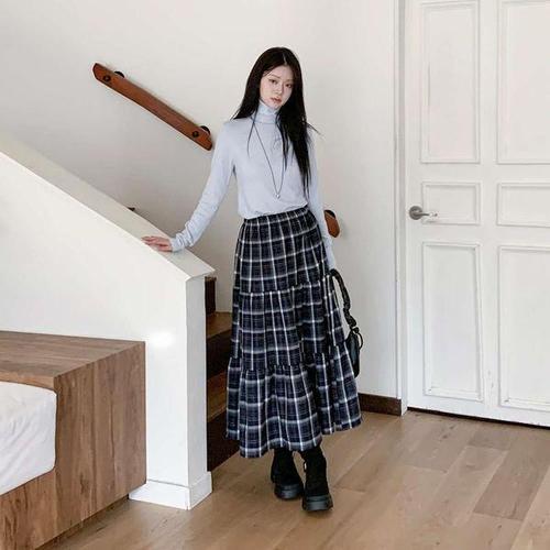 [다잇템]여성 고무줄 격자 티어드 에이라인 스커트