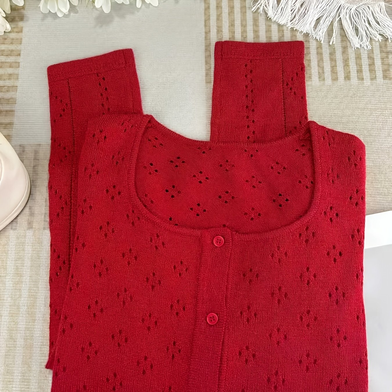 TEMU 홍콩 스타일 레드 홀로우 아웃 크로셰 가벼운 자외선 차단 탑, 부드럽고 편안한 루즈핏 반팔 재킷, 니치 스타일 캐미솔 드레스 레이어드 , 레드 우아한 조끼 코트, 레이어드 룩 다용도 가디건, 패셔너블 여성 의류