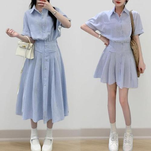 [신상오픈런]여성용 파란색 스트라이프 카라 반팔 원피스 (33650599)