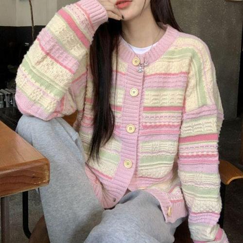 [에이치플러스몰]여성 파스텔 스트라이프 솜사탕 가디건 1P 긴팔 외투