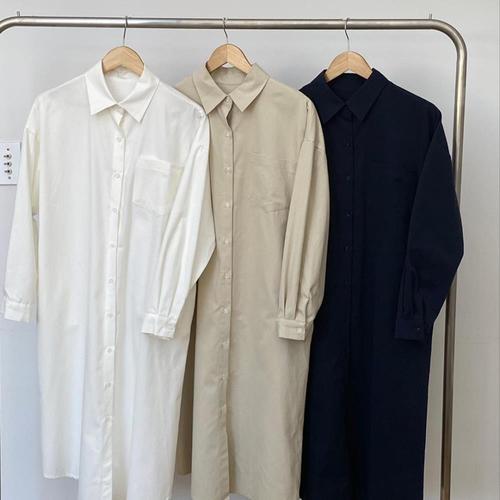 [위시드]베이직 버튼업 코튼 핀턱 셔츠 롱 긴팔 원피스 (WIACOP053)