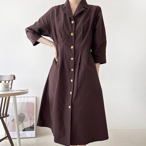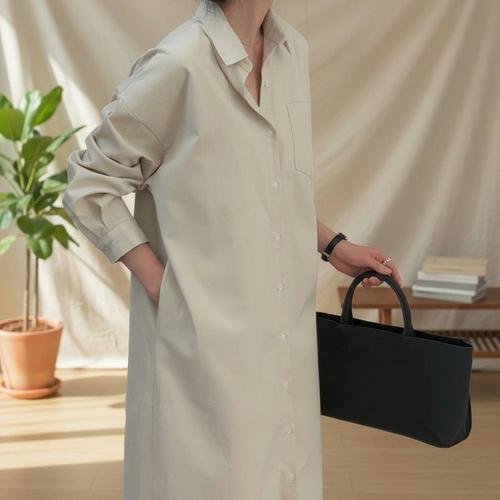 여성 단추 카라 롱 코튼 주머니 남방 원피스