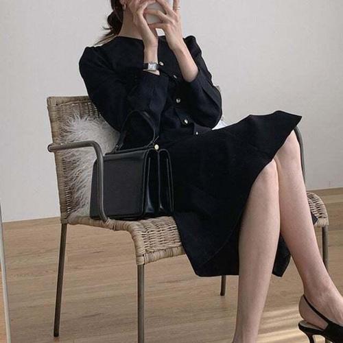 옷자락 / 여자 가을하객룩 나일론 핀턱 금장버튼 셔츠 롱원피스 (2color)