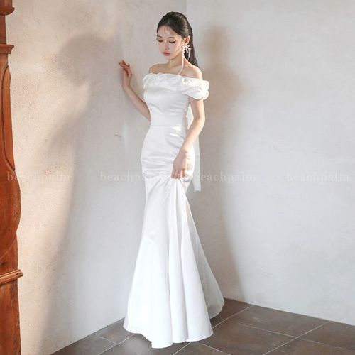 비치팜 / 미엘 오프숄더 머메이드 웨딩 드레스 셀프웨딩 시스루 오간자 쉬폰