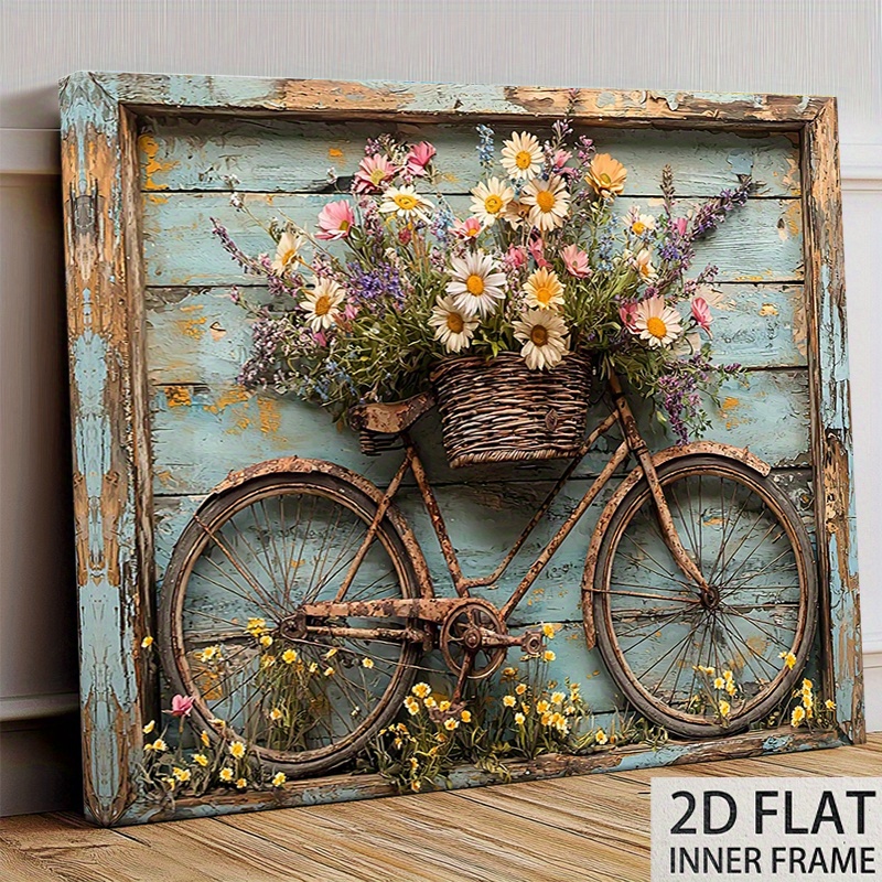 TEMU [2D 플랫] 빈티지 자전거 플로럴 캔버스 그림 1개 - 파란색 나무 프레임 벽걸이 예술, 꽃 바구니 포함, 12x16인치 소박한 홈 데코, 거실, 주방, 봄 테마 이벤트용 - 걸이용 랩핑된 캔버스 프린트, 2D 플랫, 방 꾸미기에 완벽