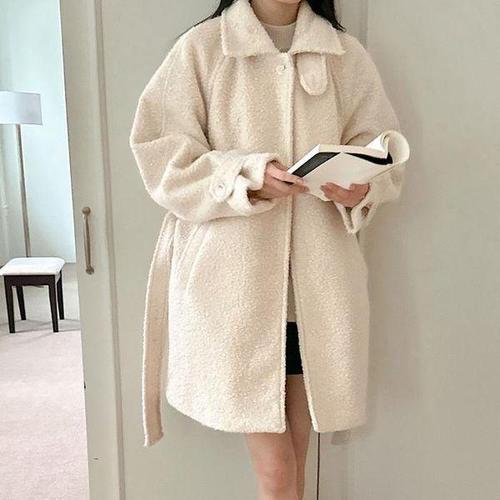 [옷자락]여자 양털 퍼코트 벨트 하이넥 시어링 겨울 하프 코트