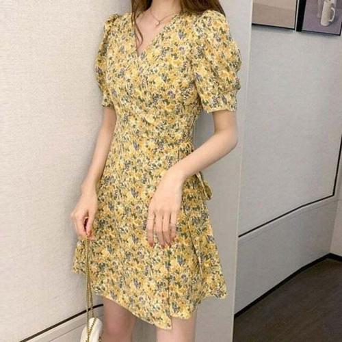 [셀럽하우스]여름원피스 GFOL6083 플라워패턴 퍼프소매 스트링 A스커트라인