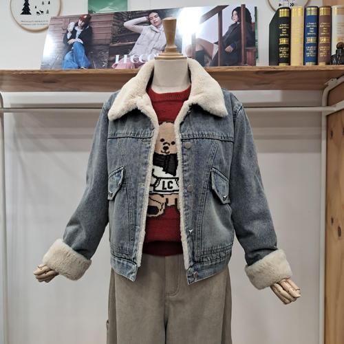 POMTOR 여성 겨울 캐주얼 루즈핏 양털 기모 데님 뽀글이자켓 청자켓 통근 코트
