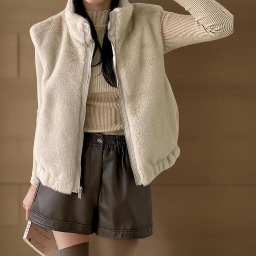 [신상오픈런]여자 겨울 부드러운 페이크퍼 밴딩 하이넥 집업 조끼 (41370120)
