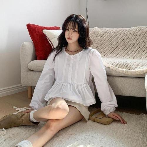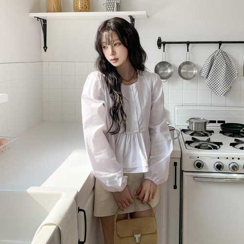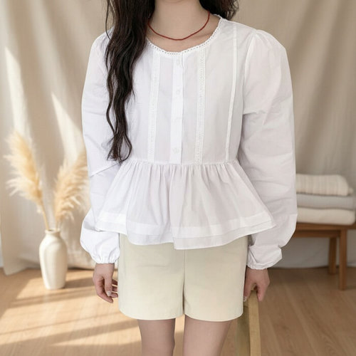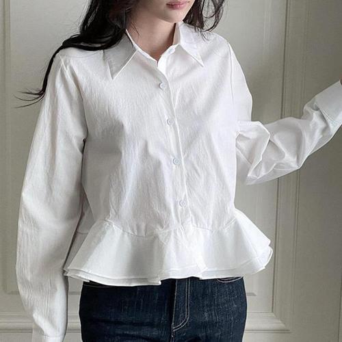 [신상오픈런]프릴블라우스 페플럼 슬림핏 세미크롭 면남방 캉캉셔츠 (30420074)