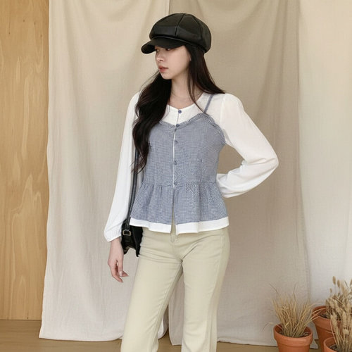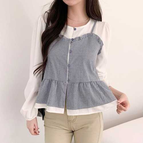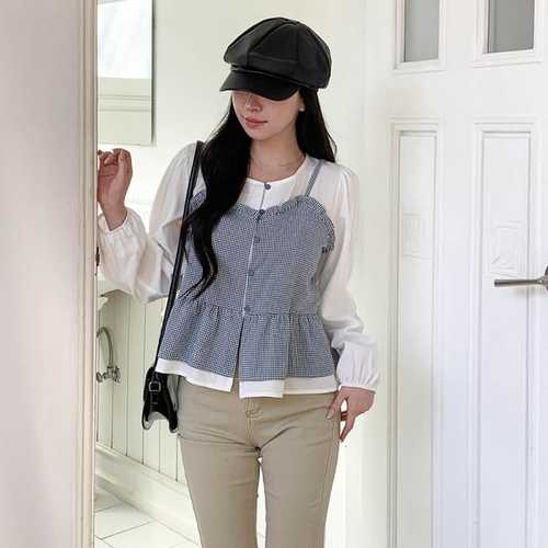 옷자락 / 여자 폴리 페플럼 체크 뷔스티에 레이어드 블라우스
