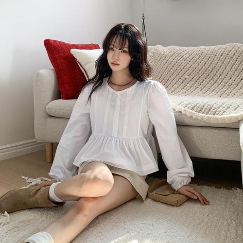 [옷자락]여성 데이트룩 로맨틱 프릴 셔링 페플럼 탑