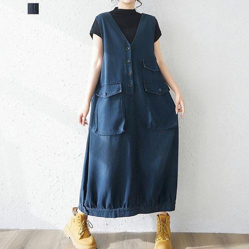 [퀸이즈] 포체 브이넥 빅포켓 숄더라인 데님 롱원피스