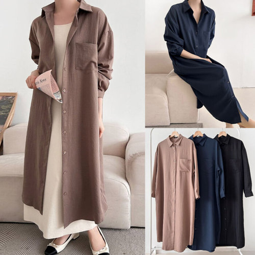 [유야]여성 면 무지 포켓 셔츠 긴팔 롱 원피스 -FOP0390- 봄 가을
