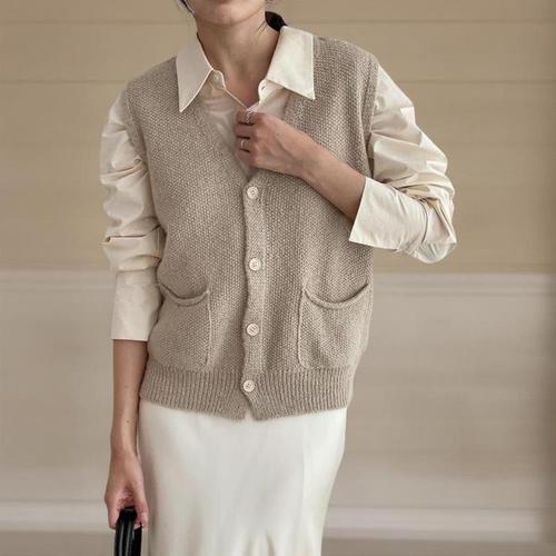 MOSAIRATION 여성 숏기장 레이어드 외출용 단색 베스트 민소매 브이넥 포켓 니트 조끼 Z0112323