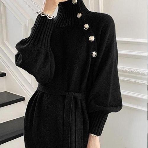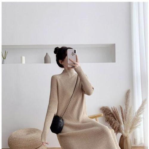 우아글로벌 터틀넥 목폴라 니트 루즈핏 롱 원피스