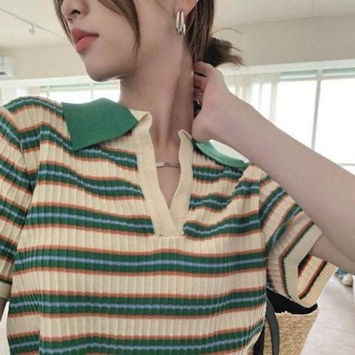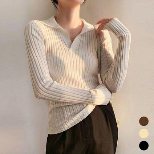 [에이치플러스몰]여자세로패턴 V넥 올데이 폴로카라 긴소매 탑