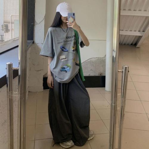 [옷자락]여자 루즈핏 폴리 그래픽 반팔 와이드팬츠