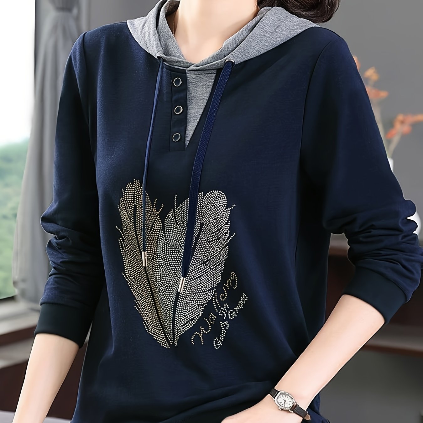 TEMU 여성용 네이비 블루 대조 후드 탑, 루즈핏 라인스톤 패턴 탑, 봄과 가을 캐주얼 출근용 다용도 긴팔 후드티, 여성용 긴팔 탑, 여성용 핏 풀오버