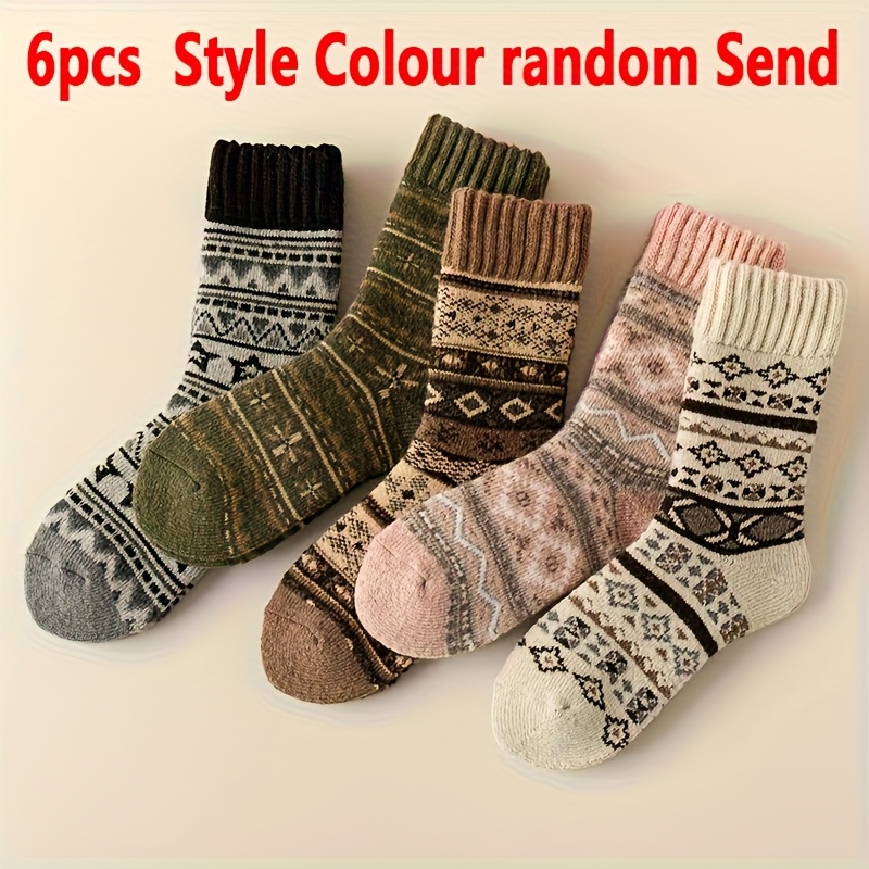 TEMU 6개 여성용 겨울용 두꺼운 따뜻한 바닥 양말 | 빈티지 에스닉 플로럴 프린트, 미끄럼 방지, 실내/침대용