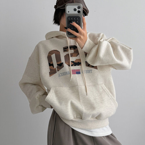 [옷자락] 여자 카모 프린팅 캥거루 포켓 퍼프 후드맨투맨 티셔츠