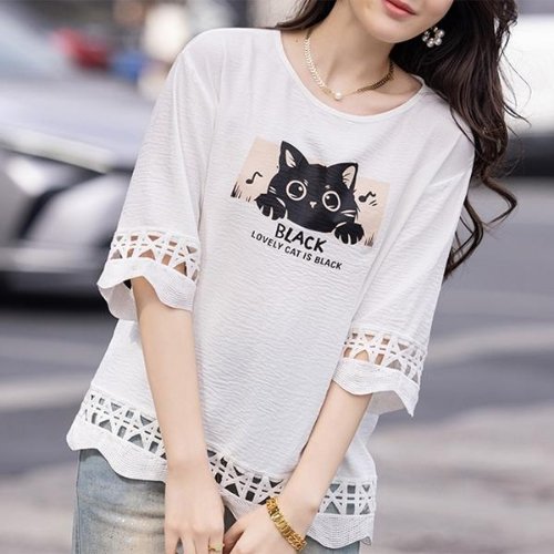 [패션시그널] 블랙캣프린팅 라운드넥 블라우스 4642B4