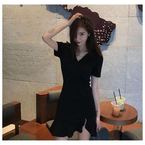 [에이치플러스몰]여성미니원피스 1P 여자 반팔 프릴 브이넥 치마 블랙