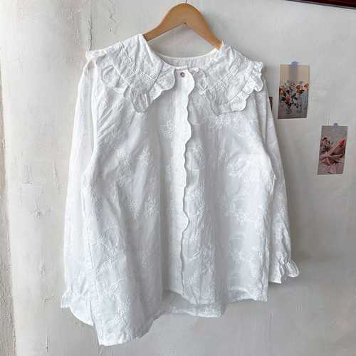 [셀러허브_여성트랜드패션]여성 프릴 카라넥 물결 꽃자수 화이트 블라우스