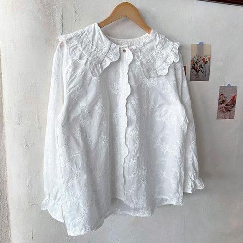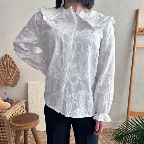 옷자락 / 여성 프릴 카라넥 물결 꽃자수 화이트 블라우스