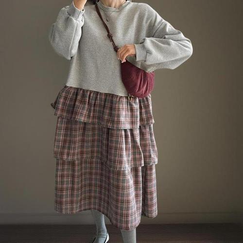 [신상오픈런]여성 체크 프릴 레이어드 롱원피스 빅사이즈 기모 캉캉 (44091932)