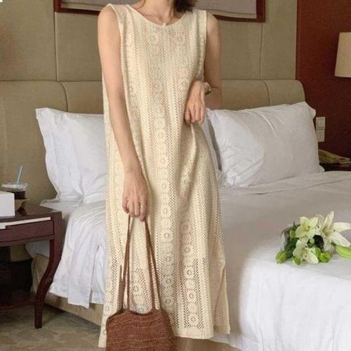 [에이치플러스몰]플라워 베이직 레이스 자수 민소매 올데이 원피스 단