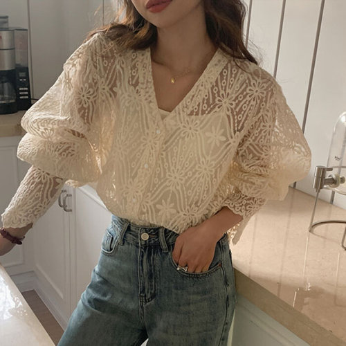 슈팅스타 / 브이넥 슬리브 플라워자수 시스루 레이스 셔츠 87355