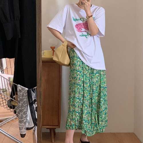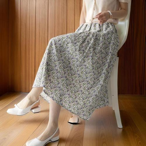 besteffie 여성용 청순한 봄여름 플라워 롱 플리츠 스커트 고무밴드 빅사이즈 치마 K37