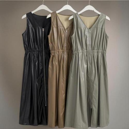 [신상오픈런]여성 브이넥 민소매 플레어 가죽 롱원피스 집업 디자인 (41564617)