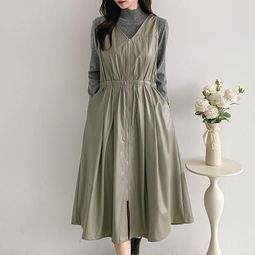 [신상오픈런]여성 브이넥 민소매 롱원피스 가죽 플레어 집업 스타일 (41564606)