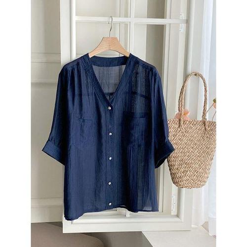 [샵앤]여성 V넥 단픈 플리츠 5부소매 시스루 블라우스 DGB-WBL-4600-네이비