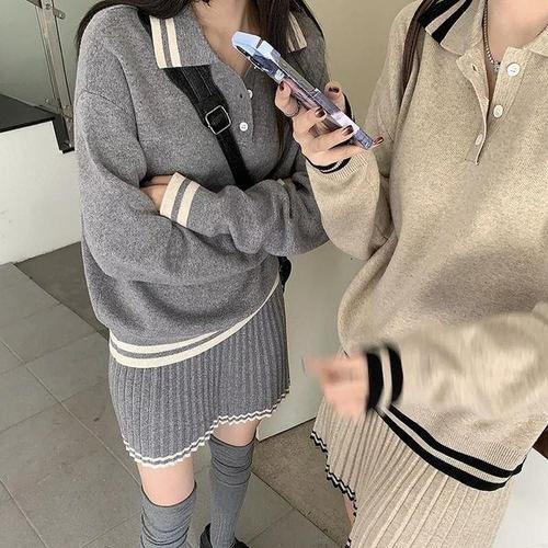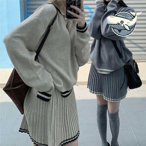 [에이치플러스몰]배색 카라 데일리 플리츠 니트 클래식 스커트 투피스