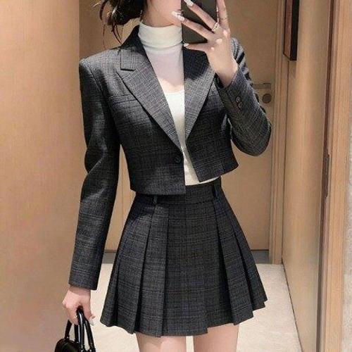 [아리엘스타일]크롭자켓투피스 플리츠스커트세트 체크투피스 힐레이