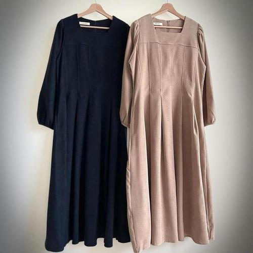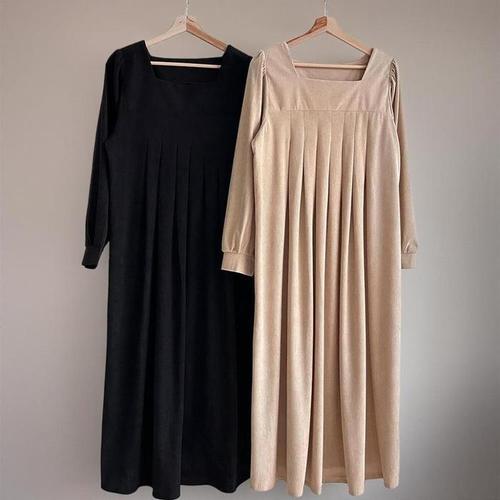 [신상오픈런]여성 스퀘어넥 플리츠 롱원피스 빅사이즈 퍼프 골덴 드레스 (42003957)