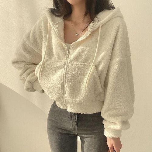 [에이치플러스몰]크롭 인기 델라피코 양털후드 집업