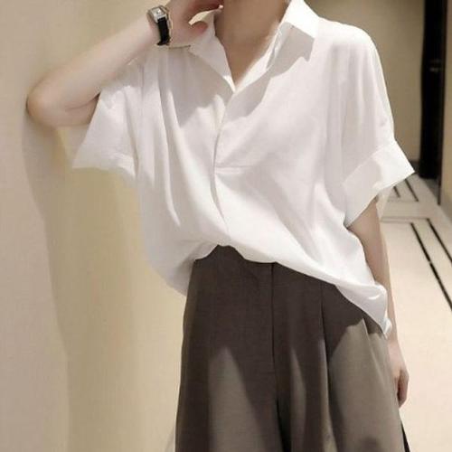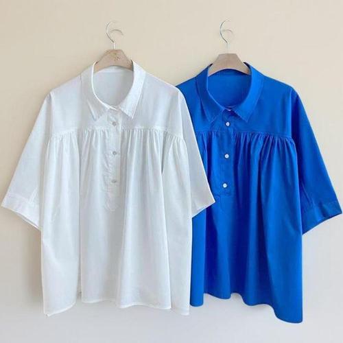 [신상오픈런]여성 클래식 루즈핏 핀턱 히든버튼 반팔 블라우스