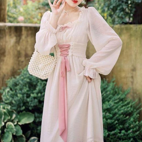 [교복몰]핑크베이지 빈티지 레이스 롱원피스 경성의상 프레피