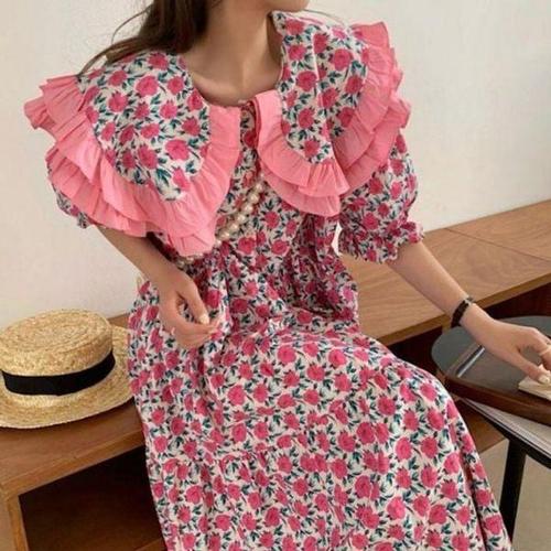 플라워 롱원피스 카라 핑크 바캉스 휴가 빅카라 여름