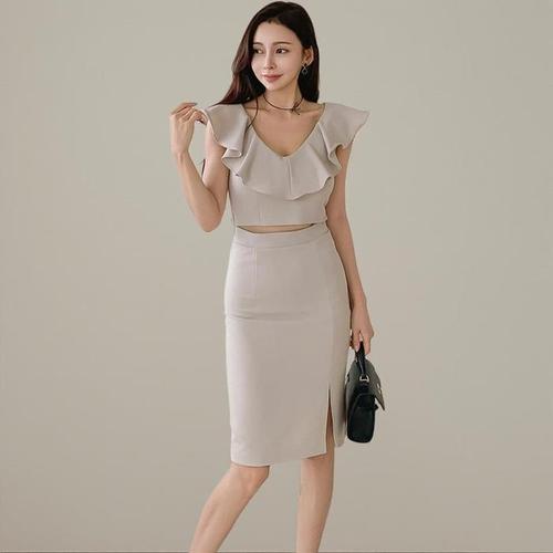 [신상오픈런]여성 하객 패션 민소매 프릴 크롭 슬릿 H라인 미디 드레스 (38170043)