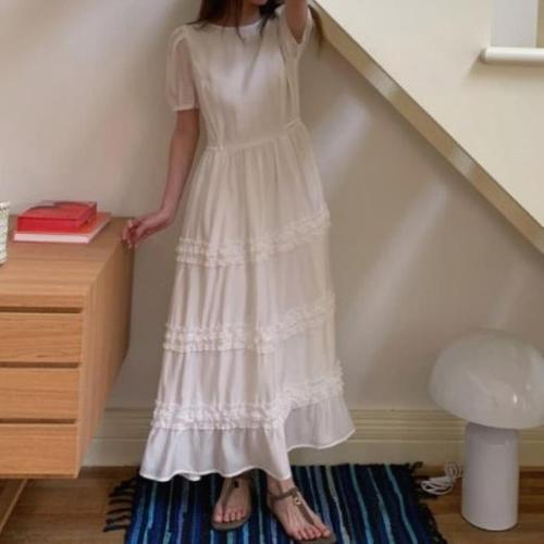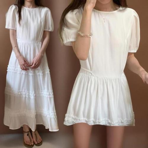 [신상오픈런]여성 레이스 랩 롱 원피스 반팔 화이트 드레스 (38541374)