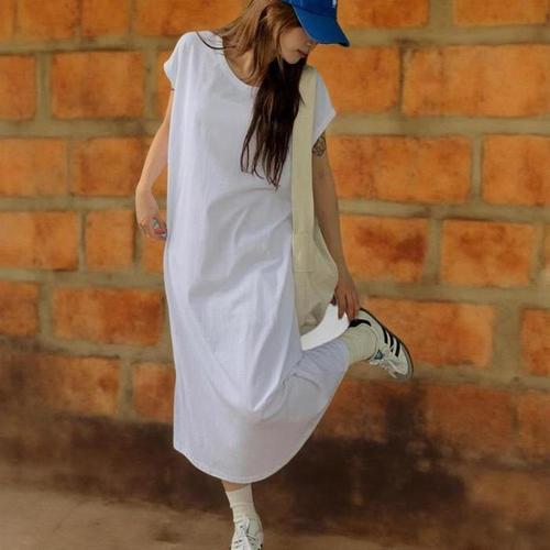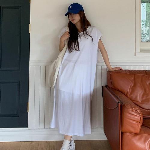 [신상오픈런]여성 빅사이즈 롱원피스 무지 흰색 캡소매 커버업 면 원피스 (39139203)