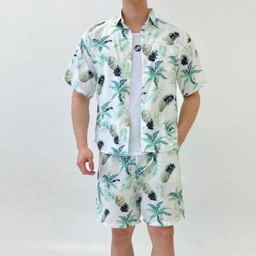 [셀러허브_여성트랜드패션]반바지 비치룩 남성 반팔 바캉스 하와이안 셔츠 세트