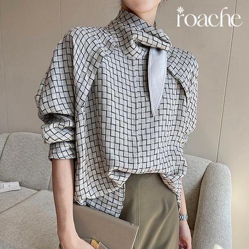 [헬렌]로아체 체인 체크 패턴 하이넥 리본 타이 블라우스 셔츠 오피스룩 봄 가을 코브타이블라우스 CH-03..