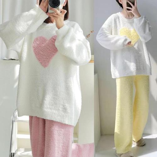 [옷자락] 여성 러블리 하트 퍼 포근 루즈핏 상하의 잠옷 세트